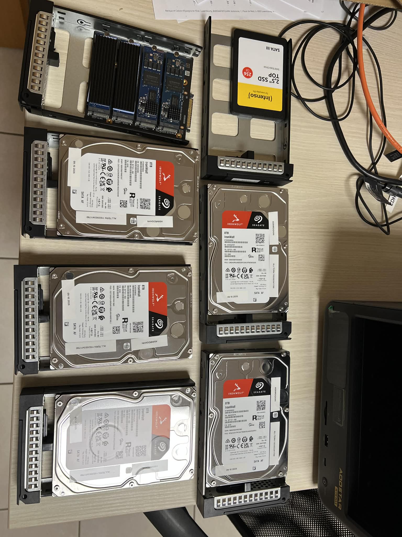 - AOOSTAR WTR MAX 8845 – AMD R7 PRO 8845HS, 64 GB of RAM NO ECC DDR5, 5X HDD 8 TB, Raid 10 + Spare, 2x Kingston Enterprie for ZFS metadata, 2x 1 TB for Cache) – Power up by TrueNas Scale Operating System. 2x Nvme 512 GB for Boot OS Raid1. – Backup System