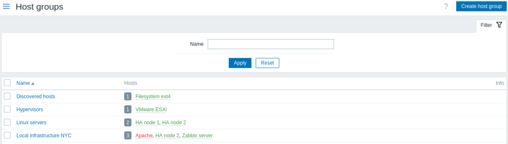 In the Configuration → Host groups section users can configure and maintain host groups.