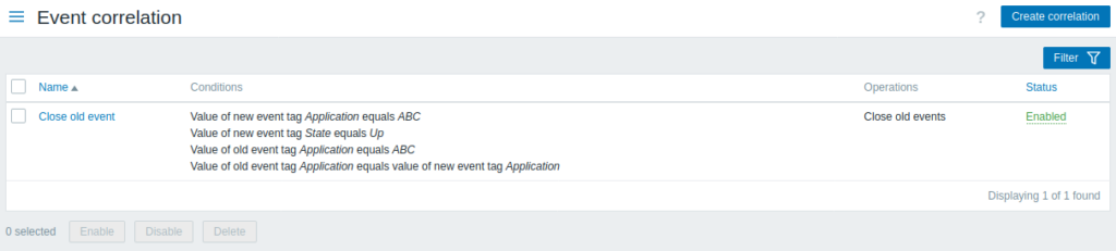 In the Configuration → Event correlation section users can configure and maintain global correlation rules for Zabbix events.